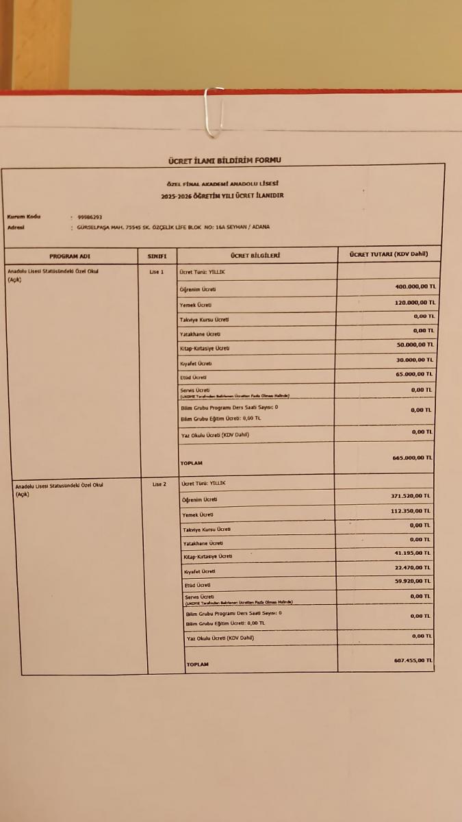2025 2026 EĞİTİM ÖĞRETİM YILI ÜCRET İLANI