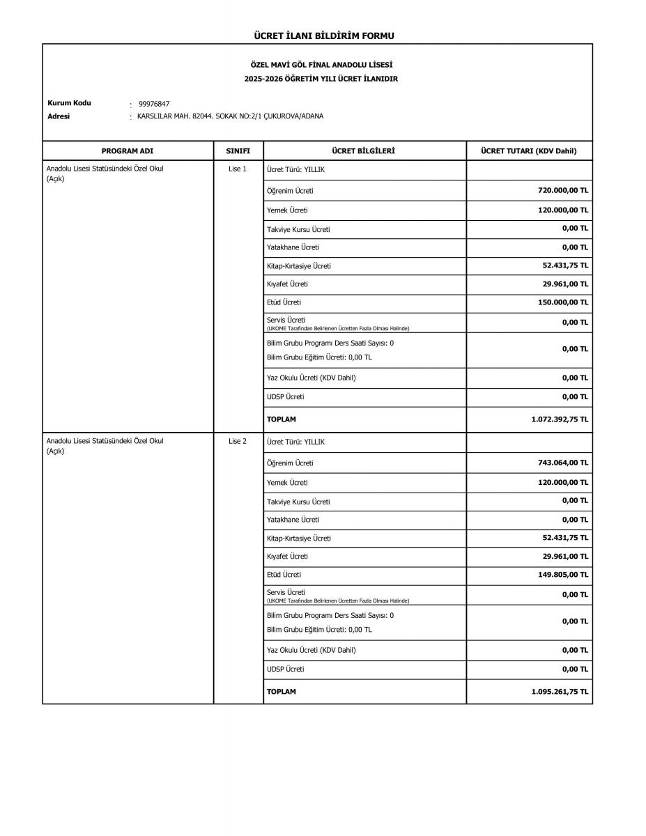 2025-2026A ANADOLU LİSESİ ÜCRET İLANI
