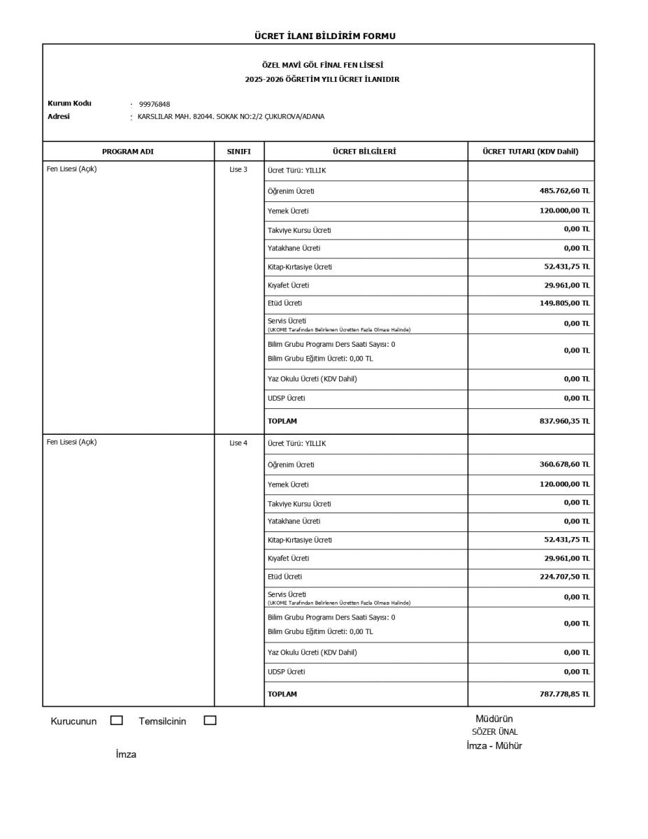 2025-2026 FEN LİSESİ ÜCRET İLANI